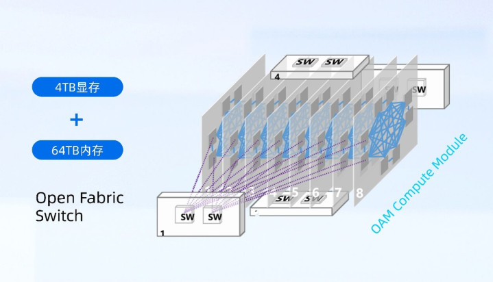 元脑SD200采用了独创的多主机3D Mesh系统架构,实现单机64路本土AI芯片高密度算力扩展,原生支持开放加速模组OAM,兼容多元AI芯片。同时,元脑SD200通过远端GPU虚拟映射技术创新,突破跨主机域统一编址难题,实现显存统一地址空间扩增8倍,单机可以提供最大4TB显存和64TB内存,为万亿参数、超长序列大模型提供充足键值缓存空间。基于创新的系统架构设计,元脑SD200单机即可承载4万亿单体模型,或者同时部署由多个万亿参数模型构成的智能体,多模协作执行复杂任务。