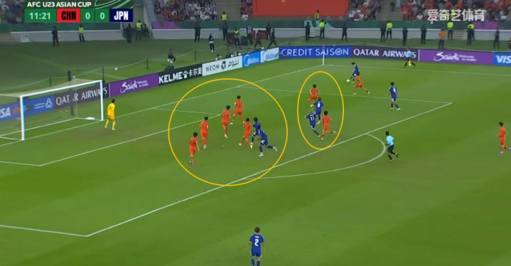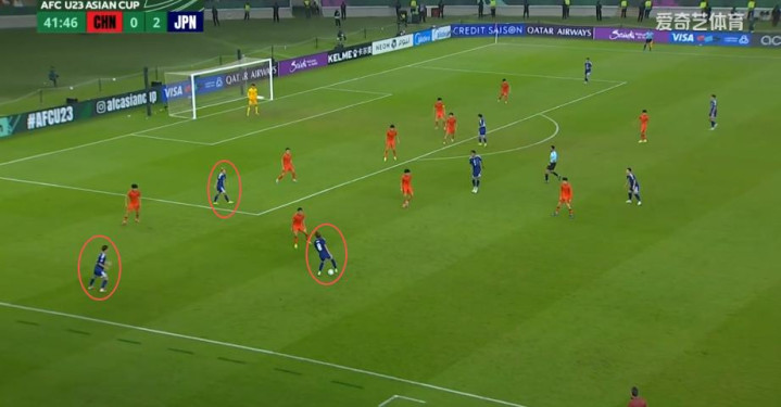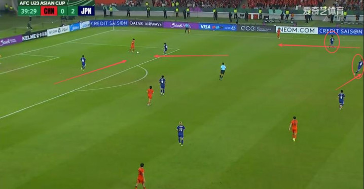 教练组安排的既定战术让你“大胆往前冲,压迫对方防线后撤”,不是让你只知道往前冲然后一直待在前面。日本U23双后腰大关友翔和小仓幸成没有一直拖在他们的三中卫前面,也没有一直卡在中路。