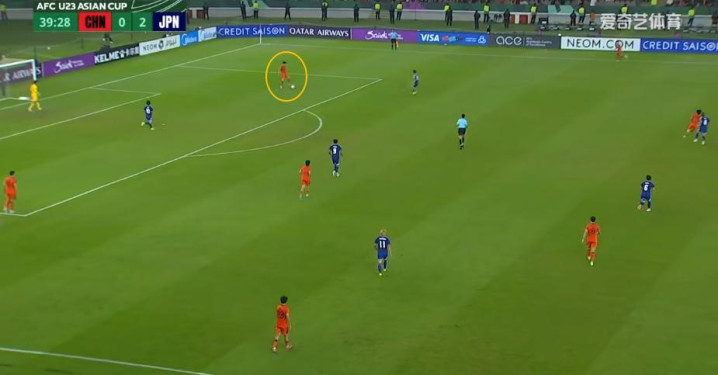 39分28秒,刘浩帆出球之前,日本U23前场正在形成高位压迫,这个时候,右前卫20号古⾕柊介在刘浩帆的正前方,10号佐藤龙之介在他左边,即我方大禁区点球点附近,左路边线处,胡荷韬正在回撤接应,而屏幕最右侧的大关友翔一直在盯防李镇全。