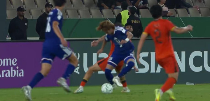 47分29秒日本U23角球二次进攻,横山梦树左侧大禁区线上单打吾米提江,转身传中(依然找后点)。