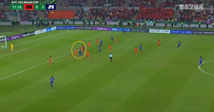 11分18秒,4号永野修都佯装把球转移到左路,突然回拉到右路,把球再次往右边路输送的时候,五后卫只有吾米提江和彭啸在盯人,其他都在看球。