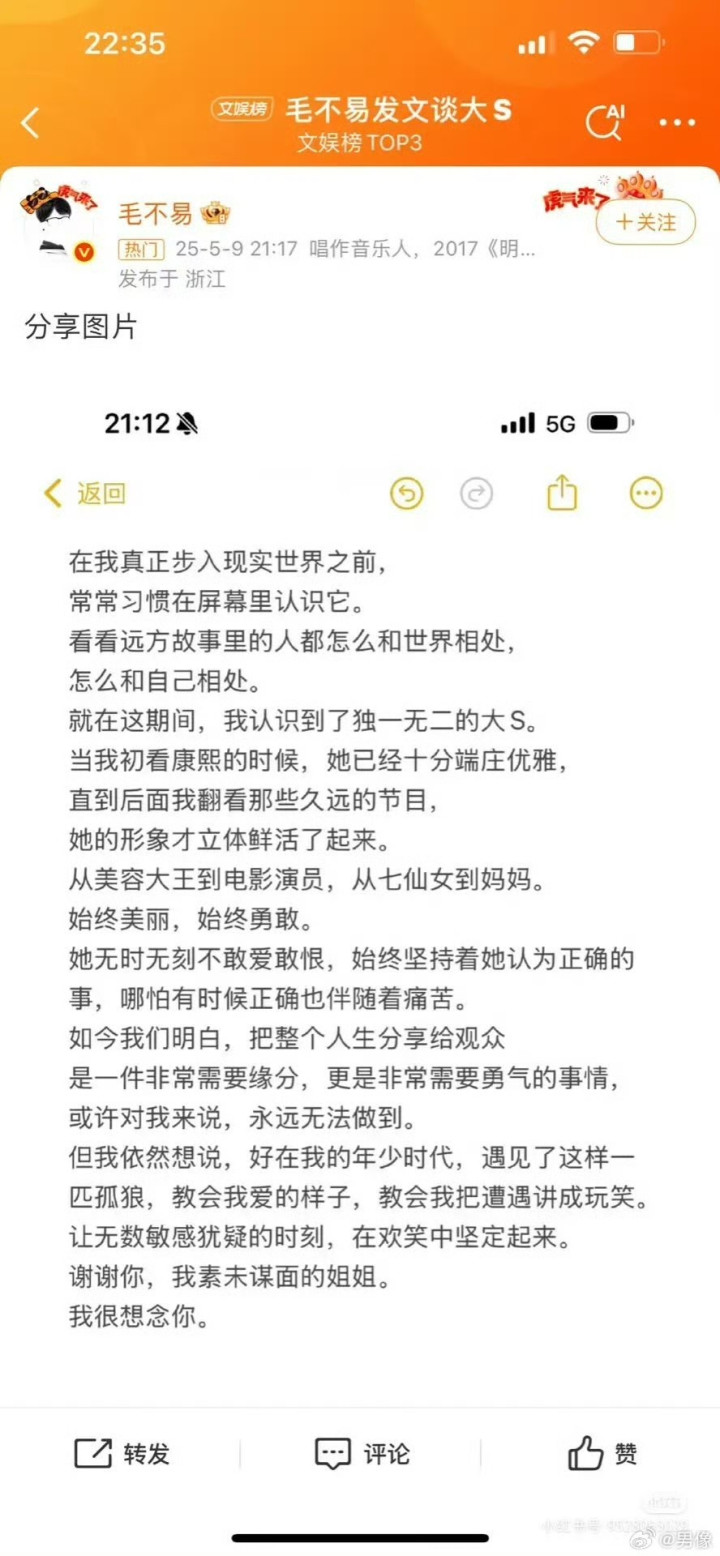 就连毛不易也发文“谢谢你,我素未蒙面的姐姐”,虽然未曾谋面,但大S的影响力依然触动了他的心。